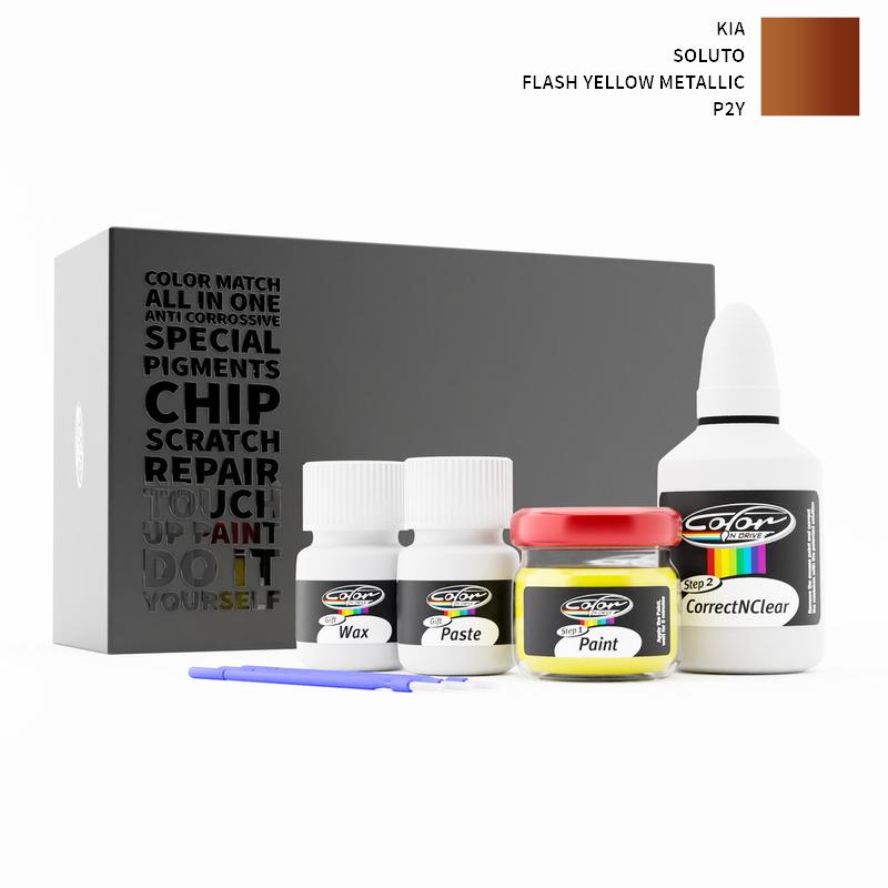 Di adiós a tus marcas de piedra y arañazos en tu KIA Soluto Flash Yellow Metallic P2Y. Con tecnología alemana patentada, Color N Drive pone fin a tu problema en tres pasos básicos. Cada KIT es preparado de forma personalizada en línea con el fabricante de tu elección de la marca de pintura original.
