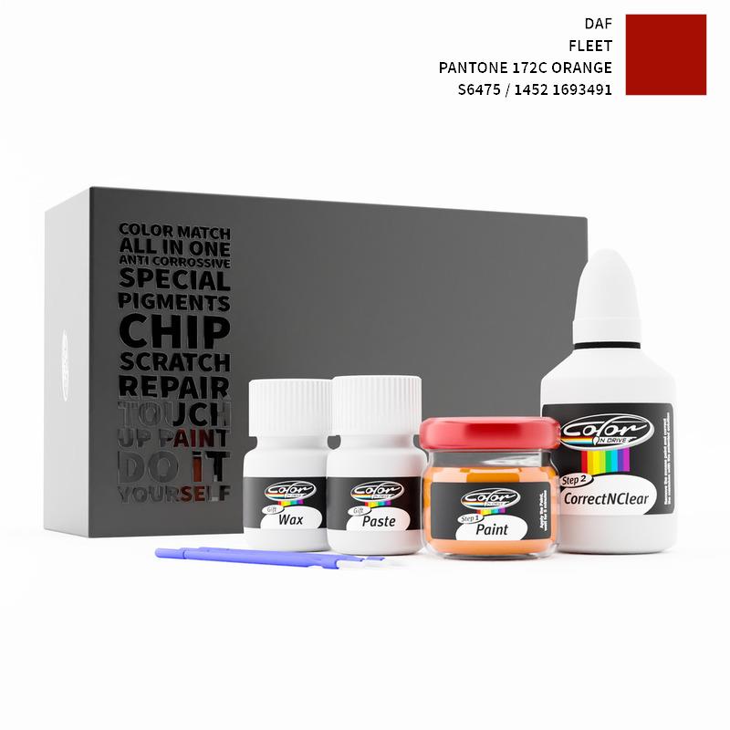 Neem afscheid van steenslag en krassen op uw DAF Fleet Pantone 172C Orange 1693491 1452 / S6475. Met gepatenteerde Duitse technologie lost Color N Drive uw probleem op in 3 eenvoudige stappen. Elke KIT wordt op maat bereid volgens de originele lakkleur van uw fabrikant.