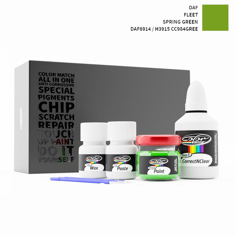 Neem afscheid van steenslag en krassen op uw DAF Fleet Spring Green DAF6914 / H3915 CC984GREE. Met gepatenteerde Duitse technologie lost Color N Drive uw probleem op in 3 eenvoudige stappen. Elke KIT wordt op maat bereid volgens de originele lakkleur van uw fabrikant.