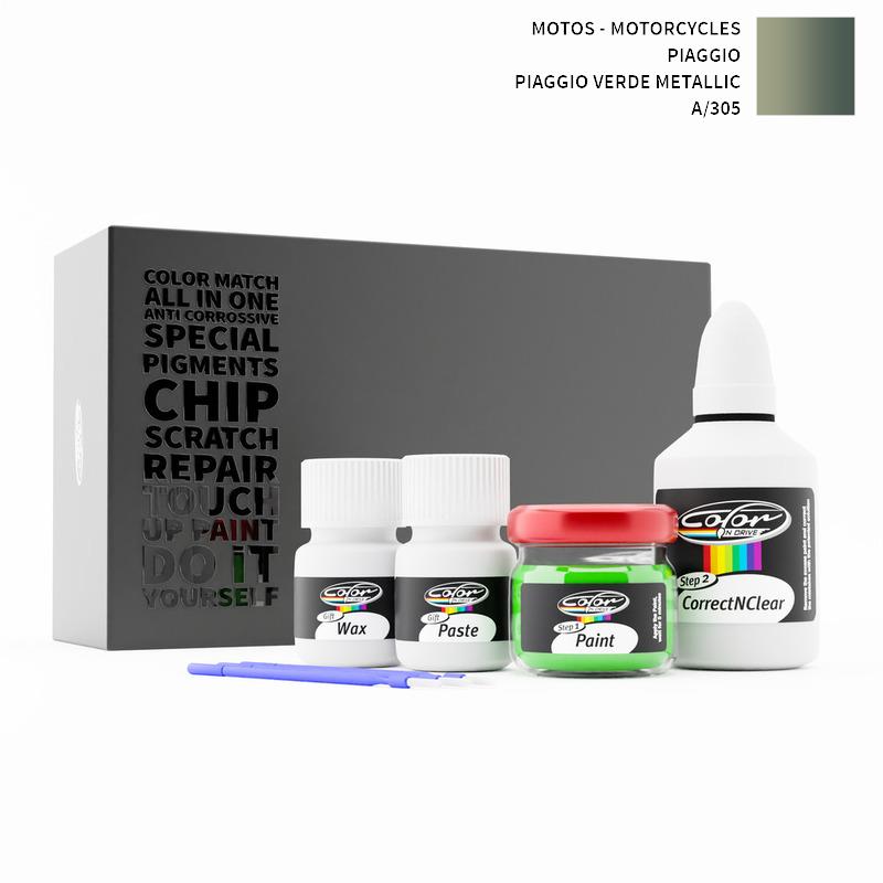 Si ha det til steinsprut og riper på din Motos - Motorcycles Piaggio Piaggio Verde Metallic 305/A. Med patentert tysk teknologi løser Color N Drive problemet ditt i 3 enkle trinn. Hvert KIT er spesialtilvirket i samsvar med bilprodusentens originale lakkfarge.