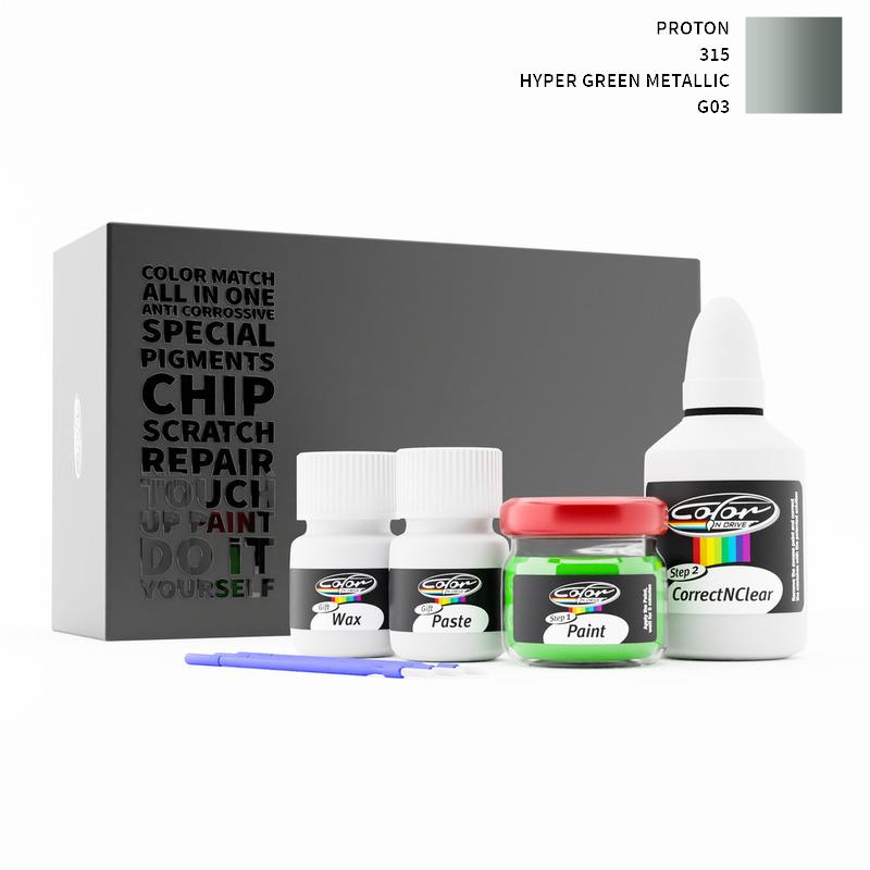 Si ha det til steinsprut og riper på din Proton 315 Hyper Green Metallic G03. Med patentert tysk teknologi løser Color N Drive problemet ditt i 3 enkle trinn. Hvert KIT er spesialtilvirket i samsvar med bilprodusentens originale lakkfarge.