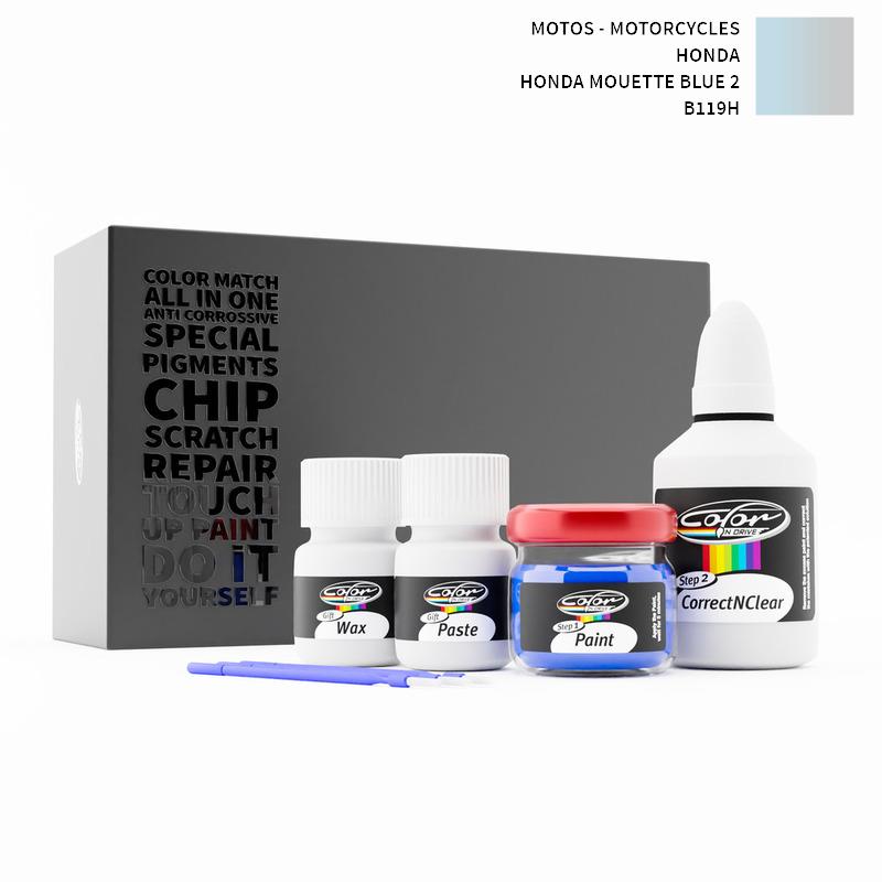 Our patented solution system only treats the special paint we mix for your Motos - Motorcycles Honda Honda Mouette Blue 2 B119H and does not interfere with your factory paint. By this method we are sure that you can not harm your Motos - Motorcycles Honda Honda Mouette Blue 2 B119H Color and you can do repairs like a pro for your Motos - Motorcycles with HONDA MOUETTE BLUE 2 color.
