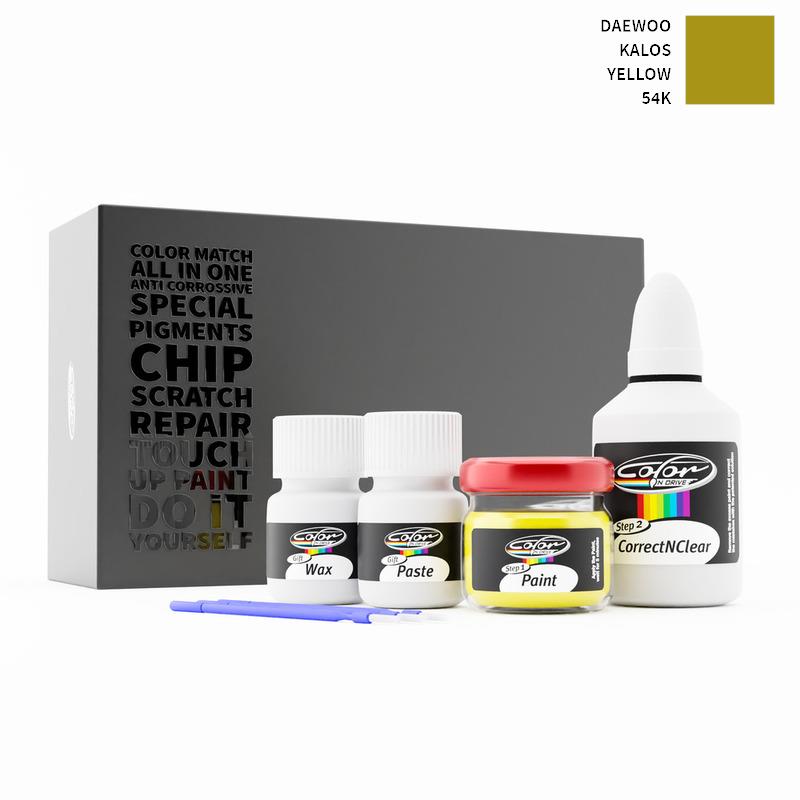 Say bye to your stone chips and scratches in your Daewoo Kalos Yellow 54K. With German patented technology Color N Drive puts an end to your problem in 3 basic steps. Evey KIT is custom prepared in line with your manufacturer's choice on original paint brand.